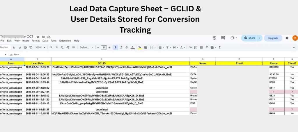 Lead Data Capture Sheet GCLID & User Details Stored for Conversion Tracking